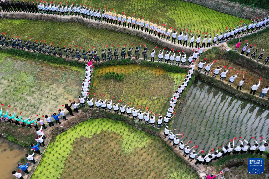 6月10日,人们在黎平县肇兴侗寨的田园中演唱侗族大歌(无人机照片)。