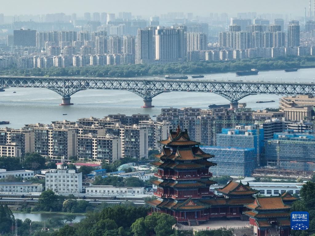 南京阅江楼与南京长江大桥(6月11日摄,无人机照片)。