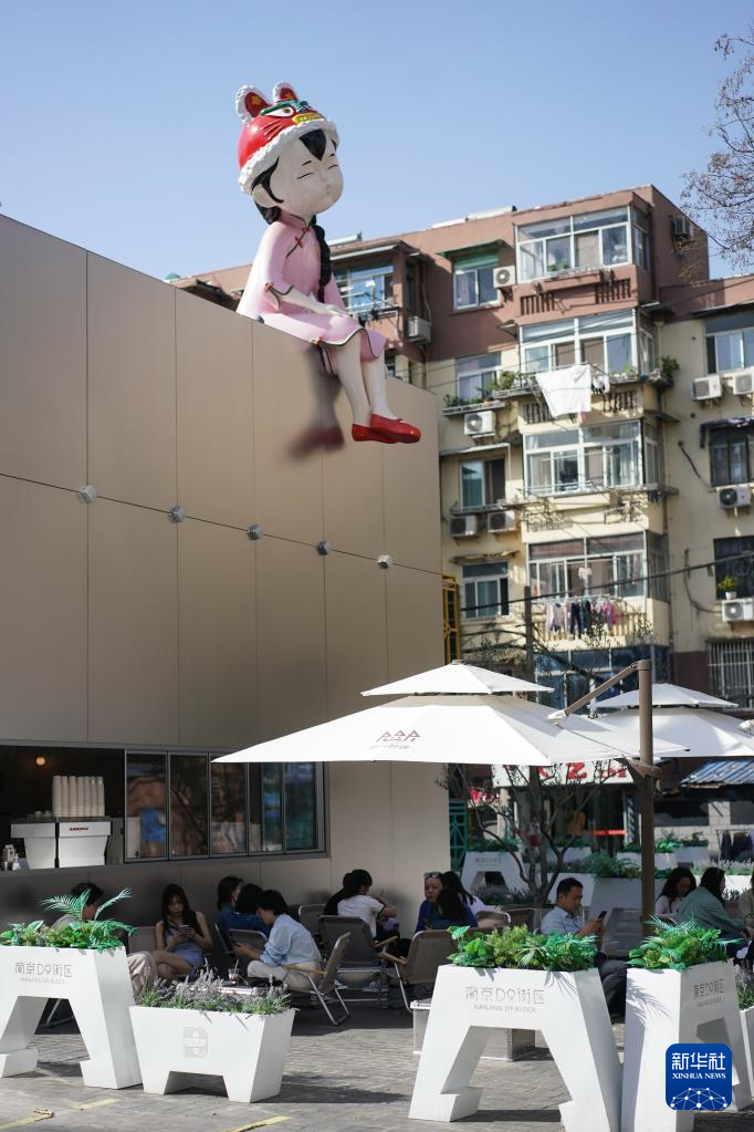 在位于玄武区的南京D9街区,市民在一家咖啡馆休闲放松(2022年4月8日摄)。D9街区是玄武区利用都市工业遗存打造的文旅消费项目。