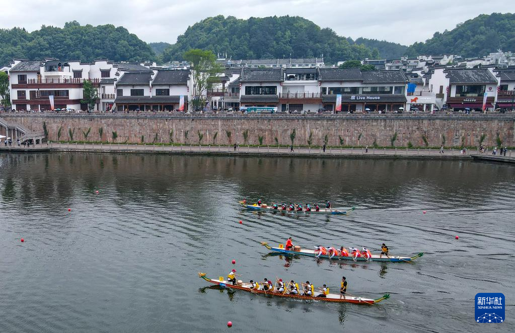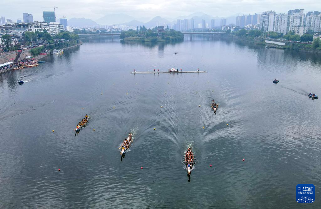 6月18日,龙舟队在安徽省黄山市屯溪区新安江水域上展开角逐。