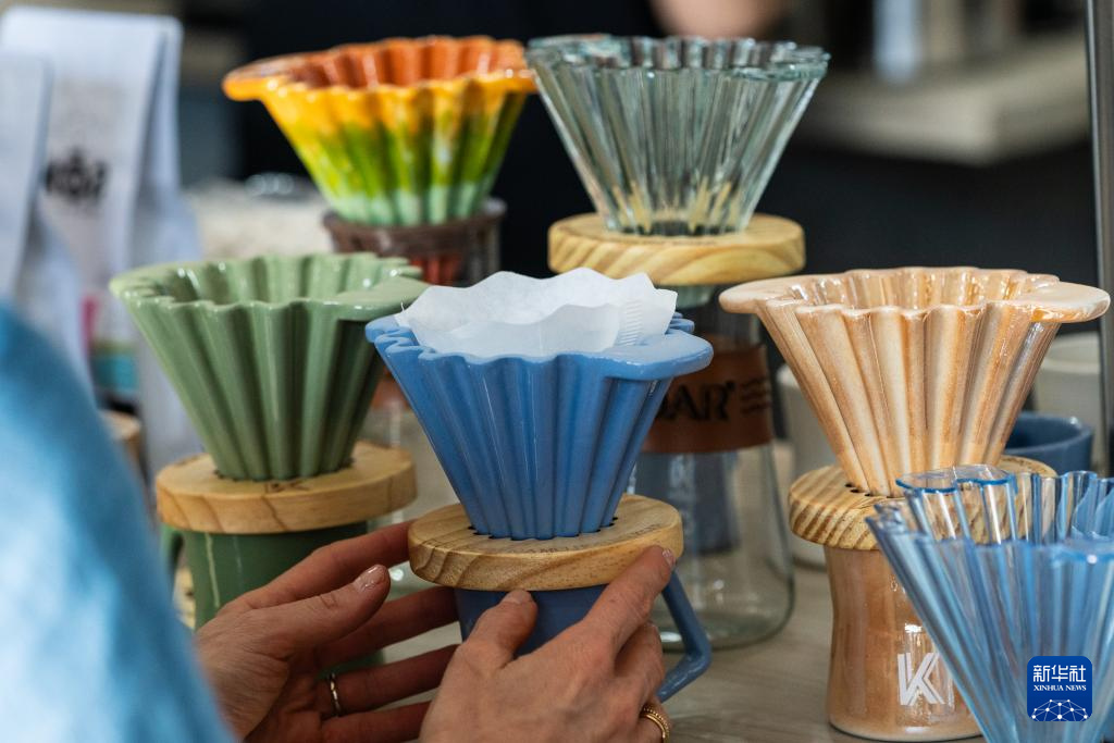 这是6月23日在巴西圣保罗举行的咖啡节上拍摄的手冲咖啡滤杯。