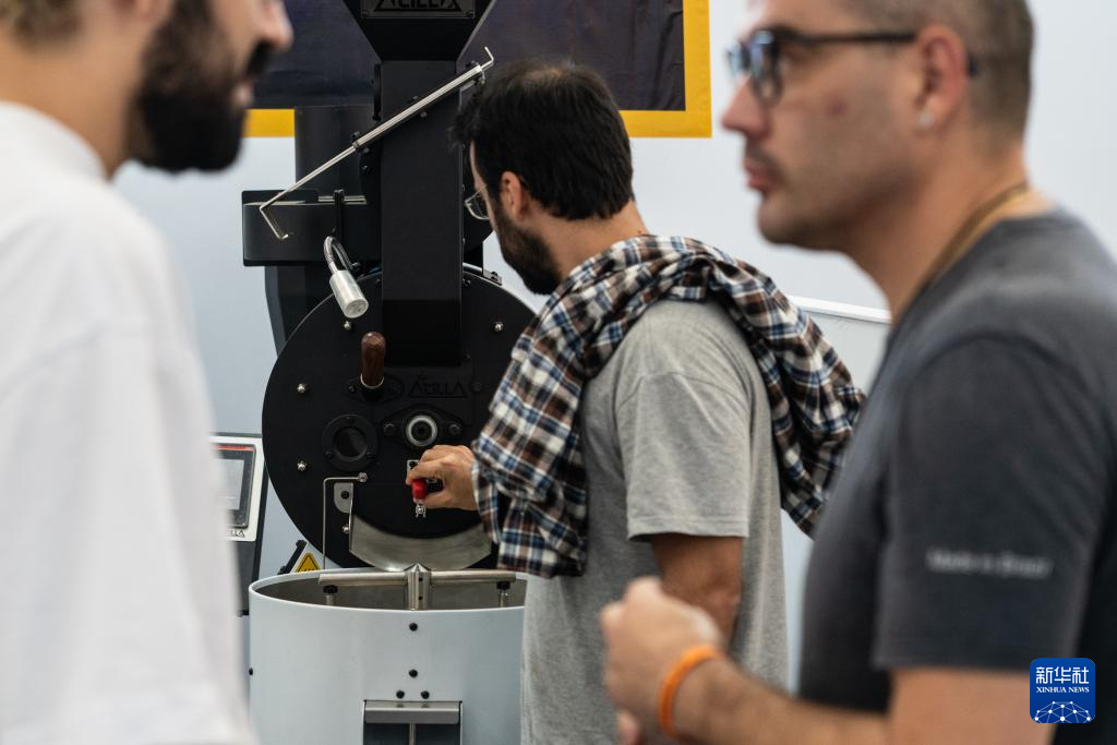 6月23日,在巴西圣保罗举行的咖啡节上,一名参观者(中)观看咖啡烘焙设备。
