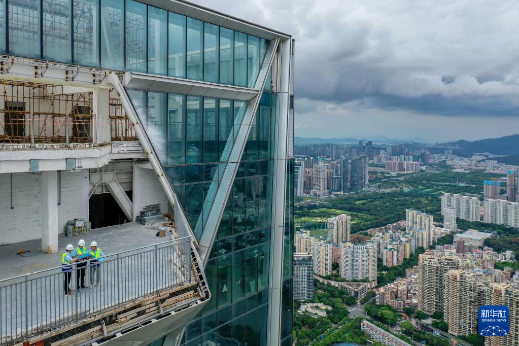 伍涛(中)和同事在350米高处的深湾汇云中心空中平台研究这里的空间装饰设计(无人机照片,6月26日摄)。