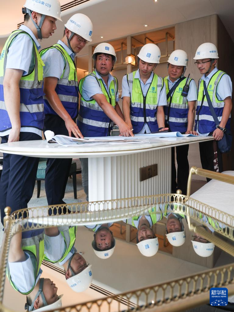 伍涛(左二)和同事在施工现场对装饰施工效果和设计方案还原程度进行比对(6月26日摄)。