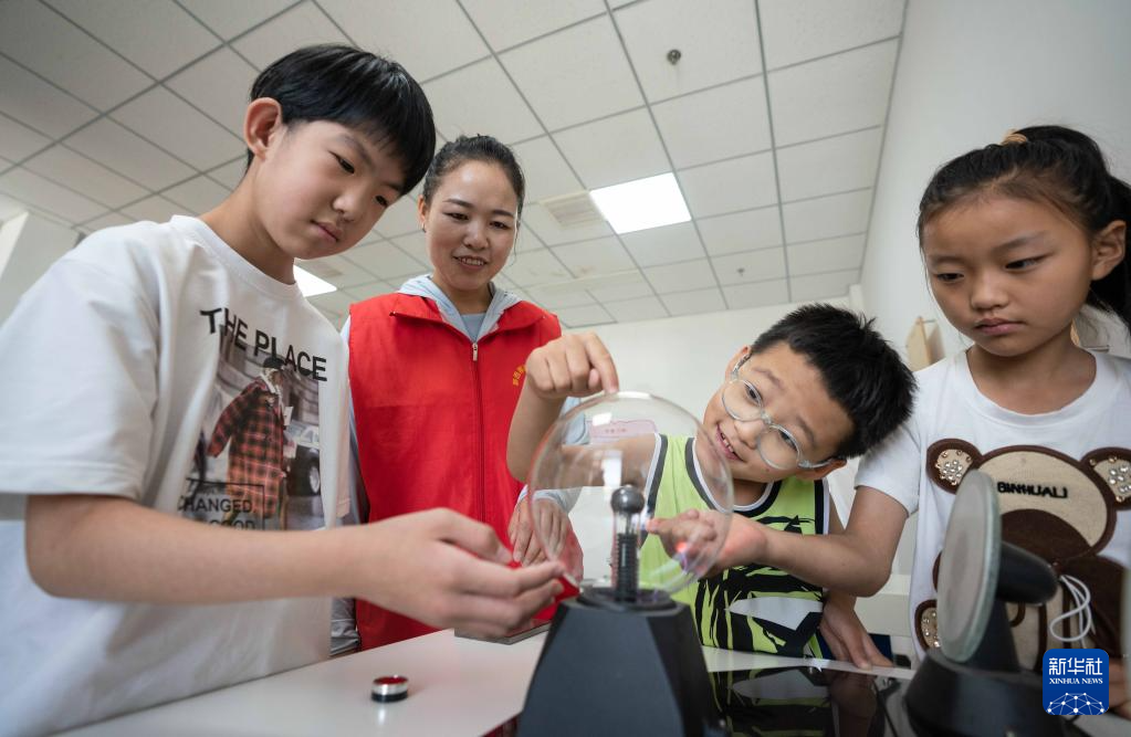 7月6日,在黄骅市海滨学院社区“多彩暑期·向阳花开”公益课堂,志愿者指导孩子操作科普小仪器。
