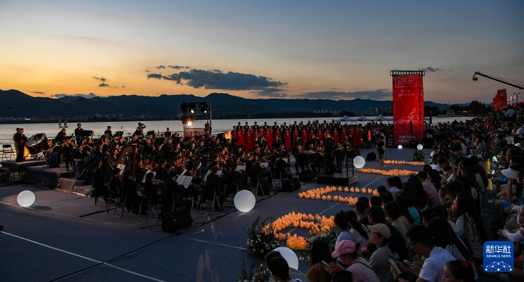 伴着晚霞,第七届聂耳音乐周昆明分会场开幕式在滇池畔举行(7月17日摄)。