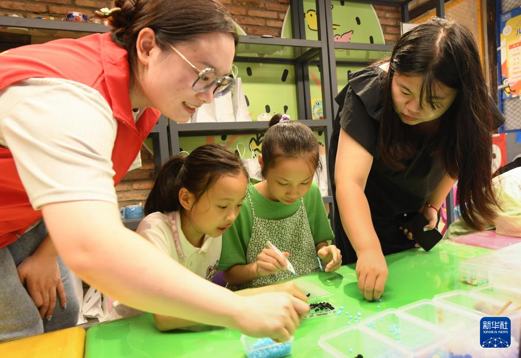 7月19日,青少年在小西街手作生活街体验“拼豆”制作。