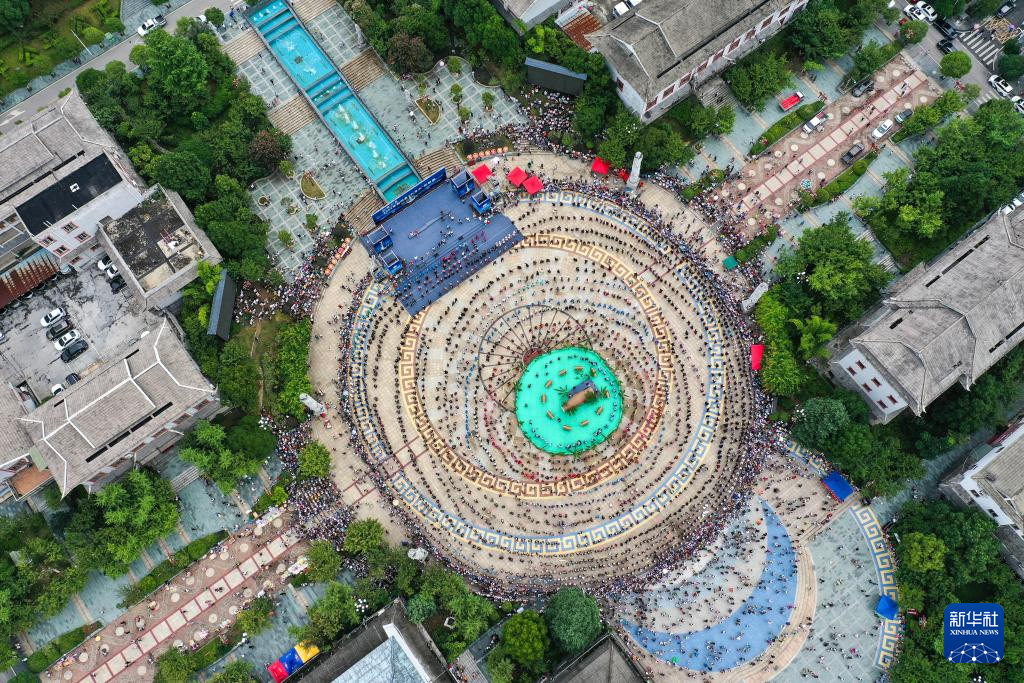 7月23日,人们在贵州剑河仰阿莎文化节上跳苗族水鼓舞(无人机拍摄)。