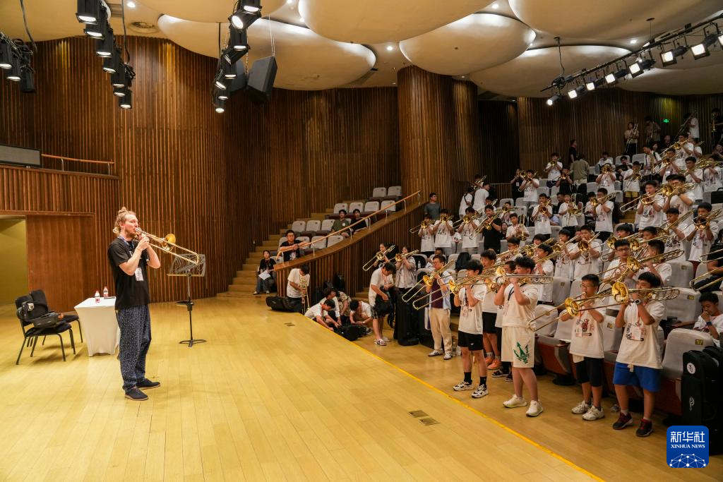 8月1日,在第九届中国国际低音铜管艺术节的一场公益大师课上,来自意大利的长号艺术家彼得·斯坦纳在指导爱好者练习长号。