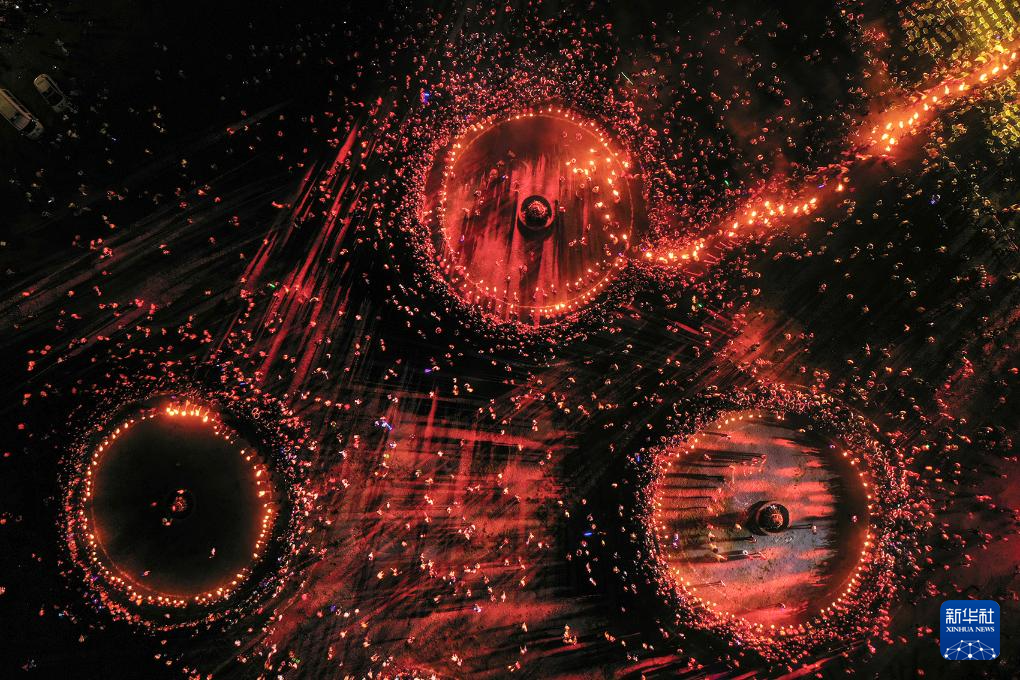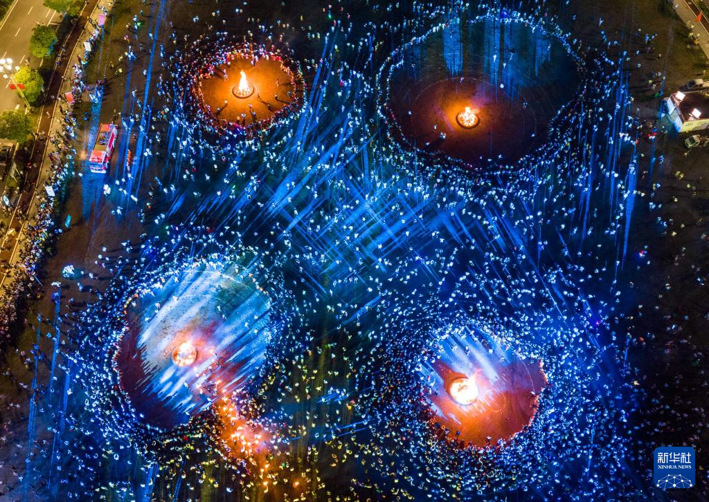 8月10日晚,群众在贵州省毕节市百里杜鹃管理区鹏程街道花瓣桥广场进行篝火狂欢(无人机照片)。