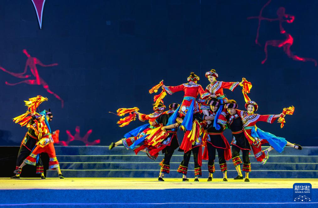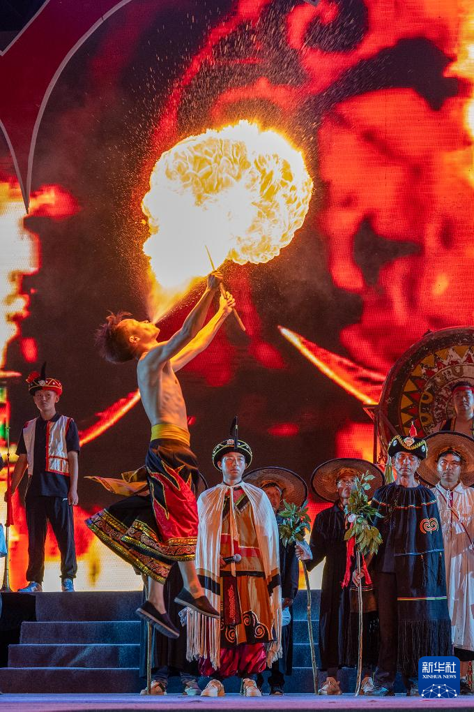 8月10日晚,演员在贵州省毕节市百里杜鹃管理区鹏程街道花瓣桥广场彝族火把节活动中表演节目。