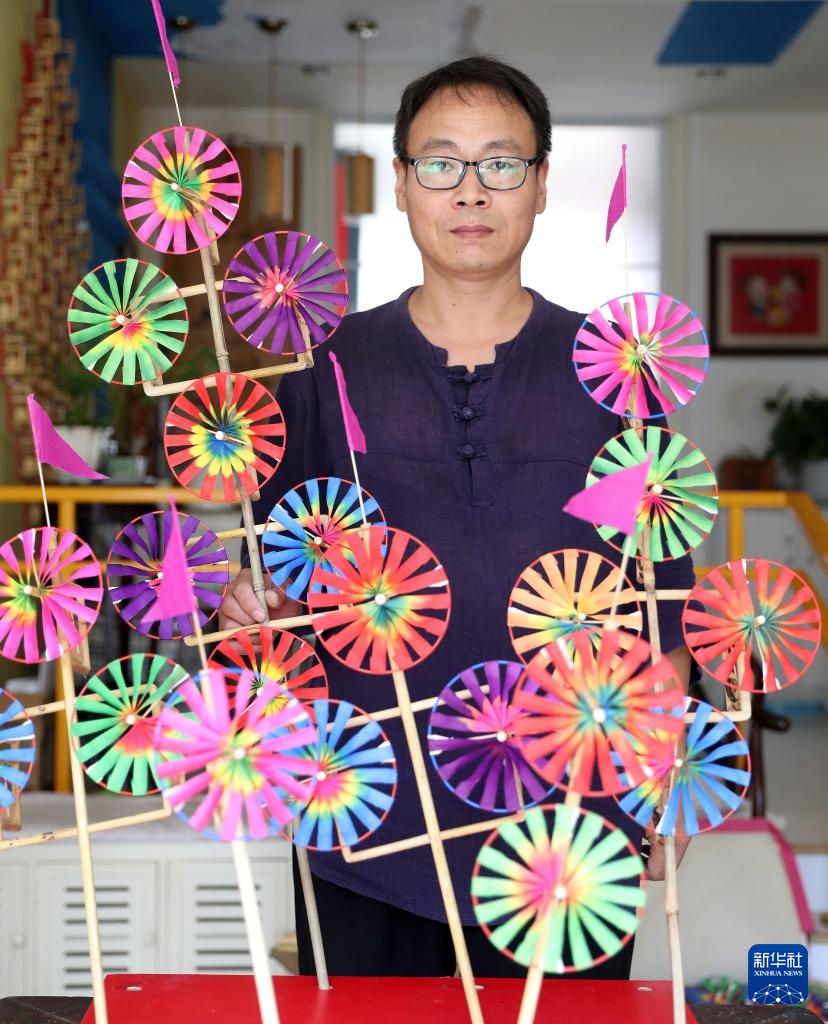 8月17日,崔凯在辽宁省营口市自己家中展示他制作的吉祥轮彩纸风车成品。