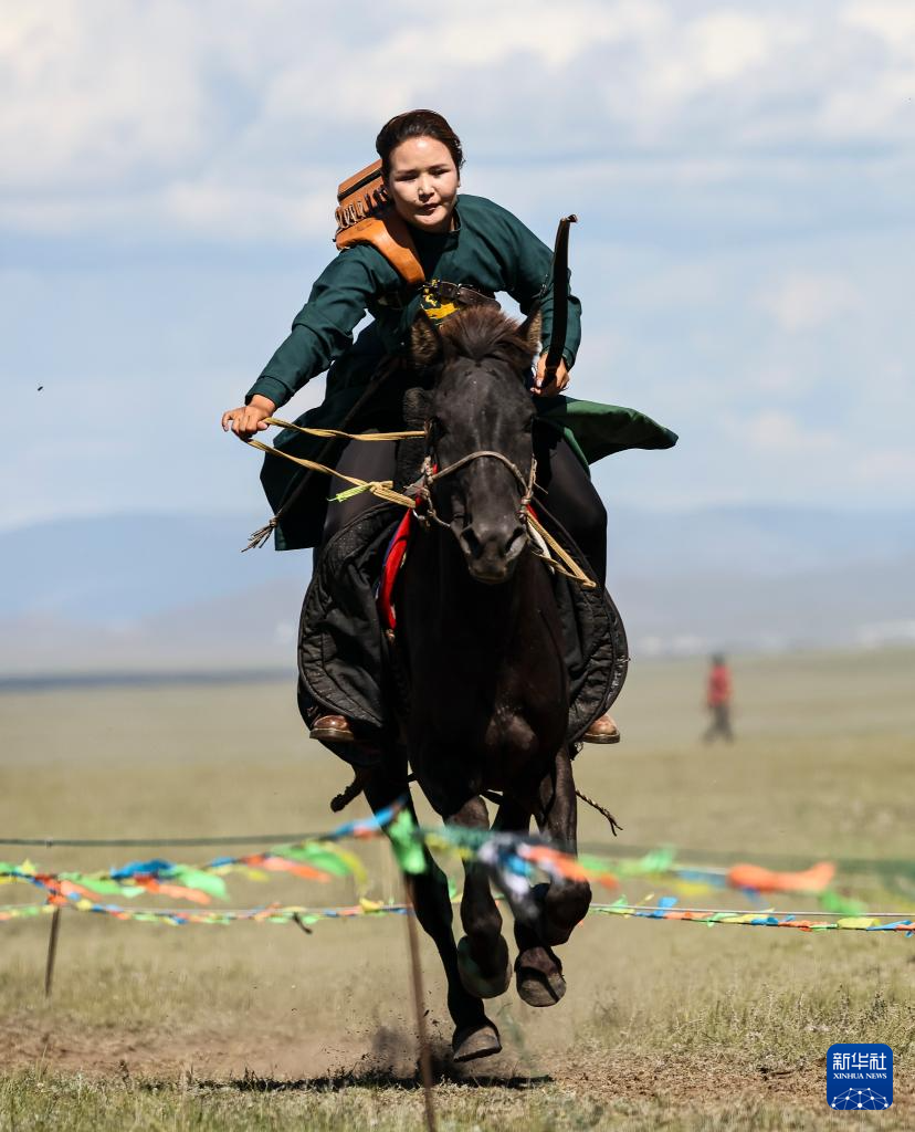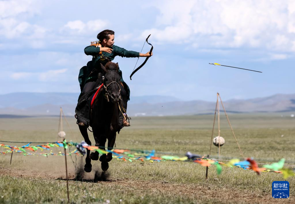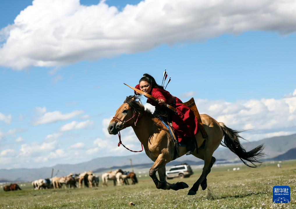 8月19日,在蒙古国泰吉山谷,一名女选手在蒙古国“游牧民族”世界文化节上展示骑马射箭。