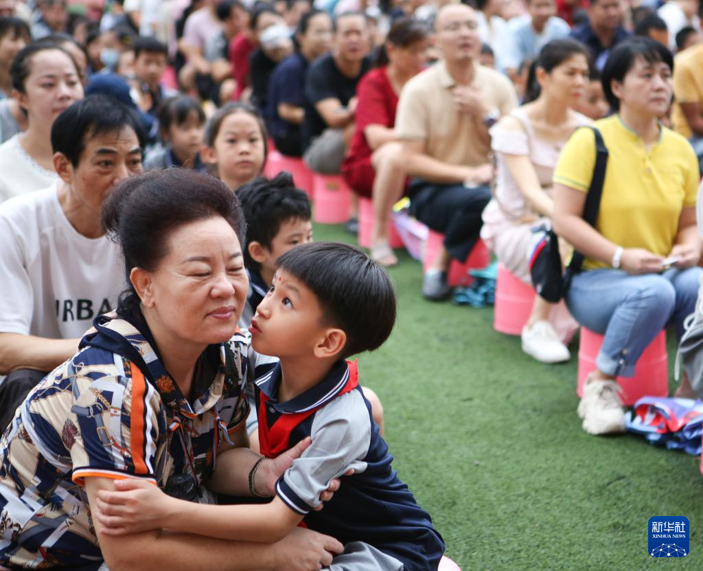 8月30日,海口市玉沙实验学校的一年级新生和家长在“开笔礼”仪式活动现场。