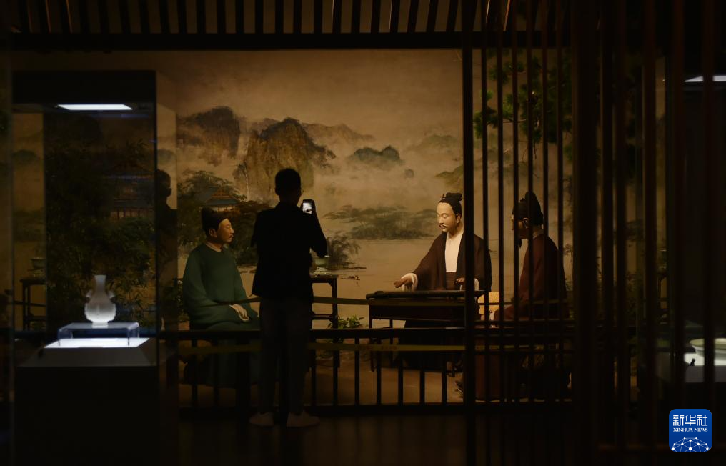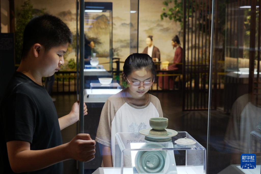 8月30日,游人在宝丰汝窑博物馆参观汝窑天青釉瓷盏托。