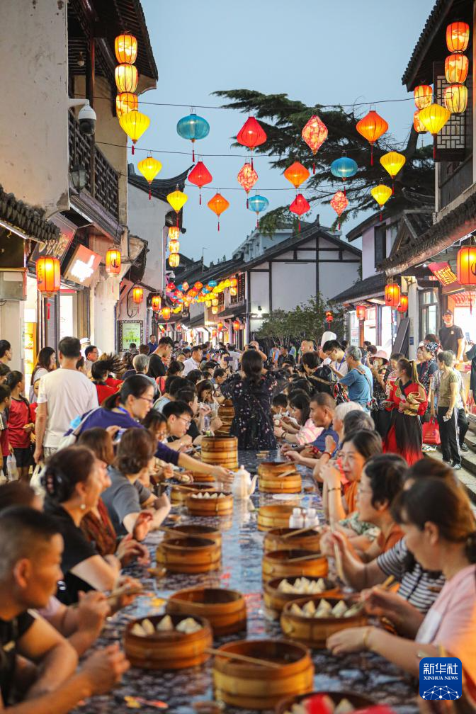 9月27日,游客在南翔小笼长街宴上品尝南翔小笼。