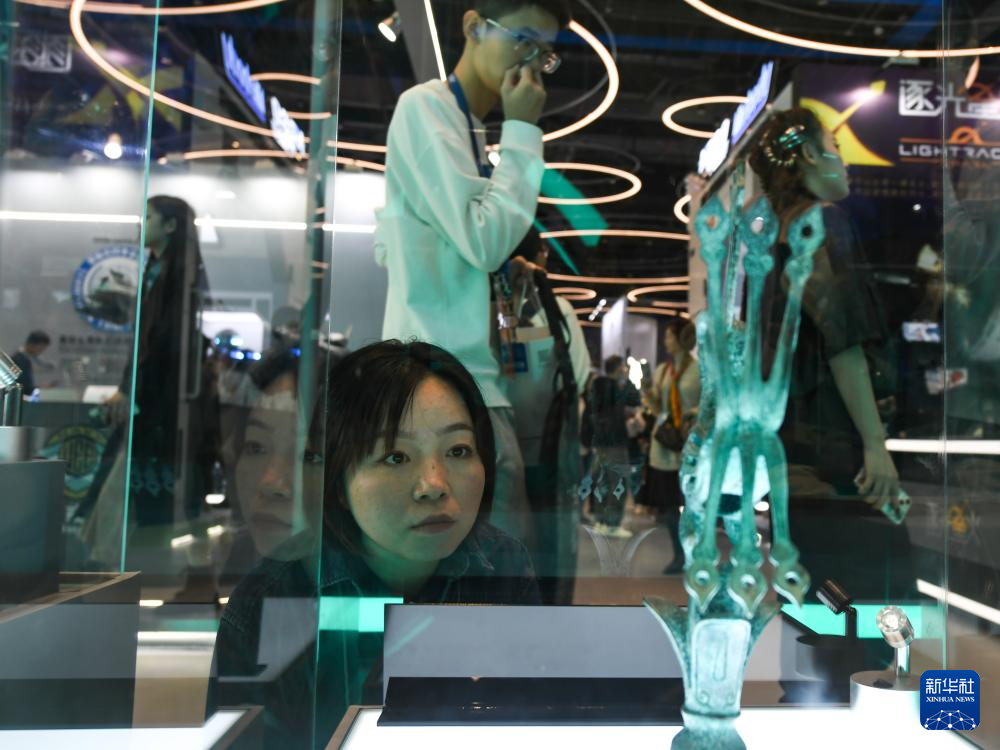 10月19日,在2023成都世界科幻大会主场馆雨果厅,观众在观看金沙遗址出土文物的仿制品。