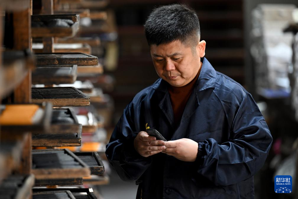10月24日,在安徽省黄山市歙县老胡开文墨业有限公司,周健在查看通风晾制的墨。