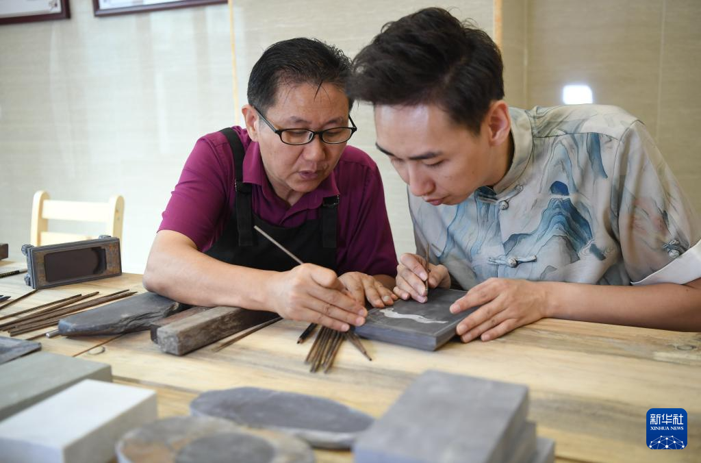 10月26日,在广东肇庆柳新祥端砚艺术馆的工作室,柳新祥(左)和儿子柳飞探讨端砚制作技艺。