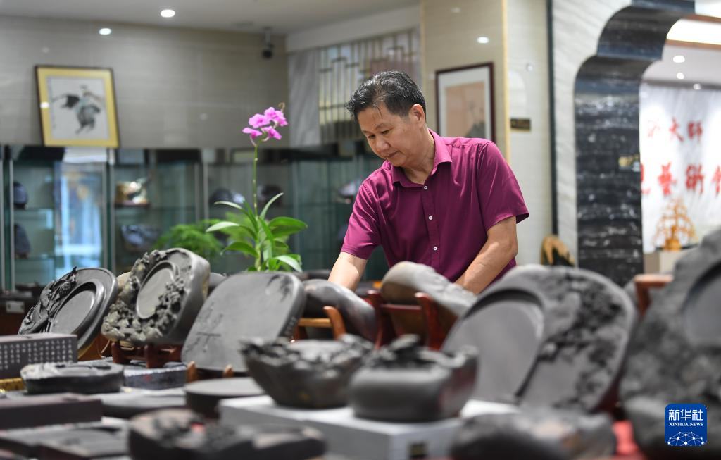10月26日,在广东肇庆柳新祥端砚艺术馆,柳新祥在布置端砚作品。