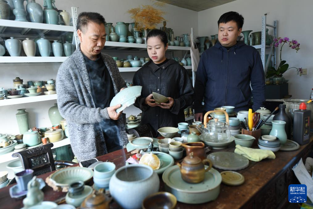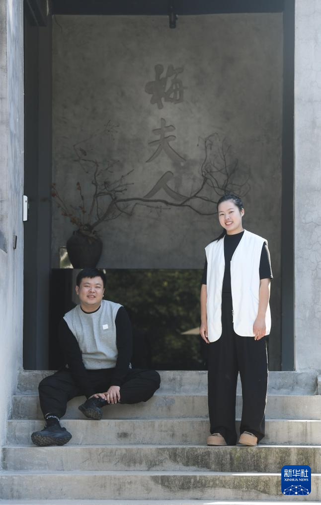 “95后”陶瓷夫妻档季双俊和季资美是高中和大学时的同学,因为共同的兴趣走到一起。从景德镇陶瓷工艺美院毕业后回到故乡龙泉,夫妻二人在瓯江旁的炉田村驻扎下来,成立了“梅夫人”工作室,潜心钻研北宋风格的青瓷器。两人从古瓷中寻找灵感,力图重现北宋龙泉窑的胎釉特点,并借鉴青铜器、金银器、古代服装上的纹样,在瓷上倾注对传统文化的热爱。