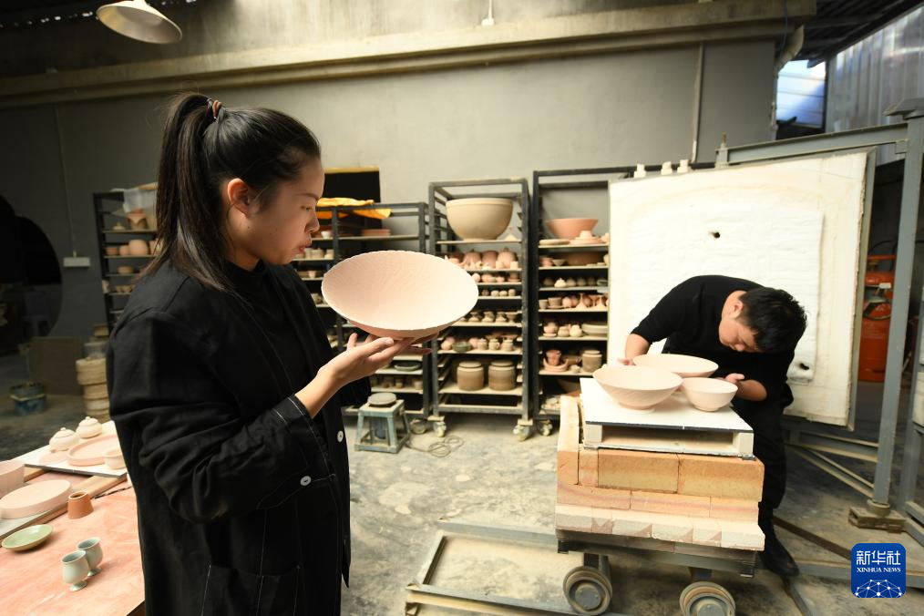 10月31日,在“梅夫人”工作室,季资美吹去瓷坯上的灰尘,准备装窑烧制。