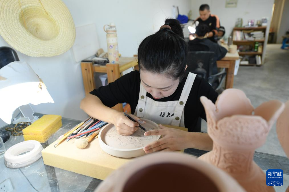 10月31日,在“梅夫人”工作室,季资美在瓷坯上刻绘。