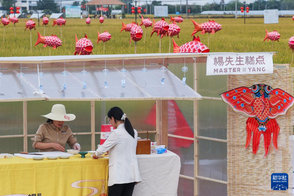11月3日,在渔山乡千亩省级粮食生产功能区的稻田内,乡村集市摊位展示和销售特色糕点。