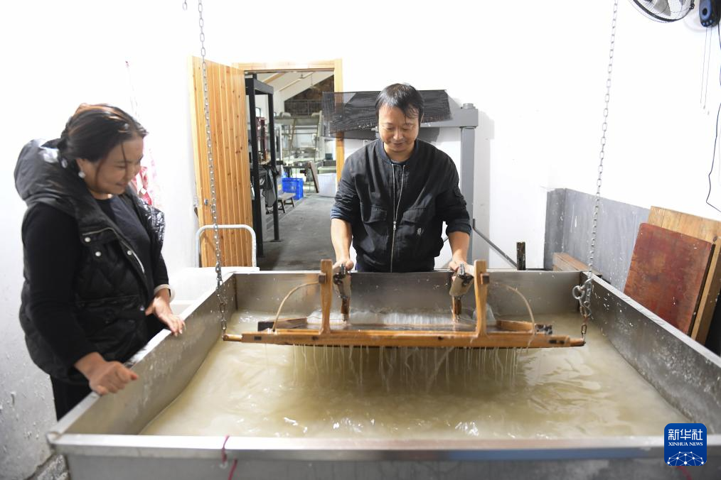 11月9日,工作人员在开化纸传统技艺工坊制纸。