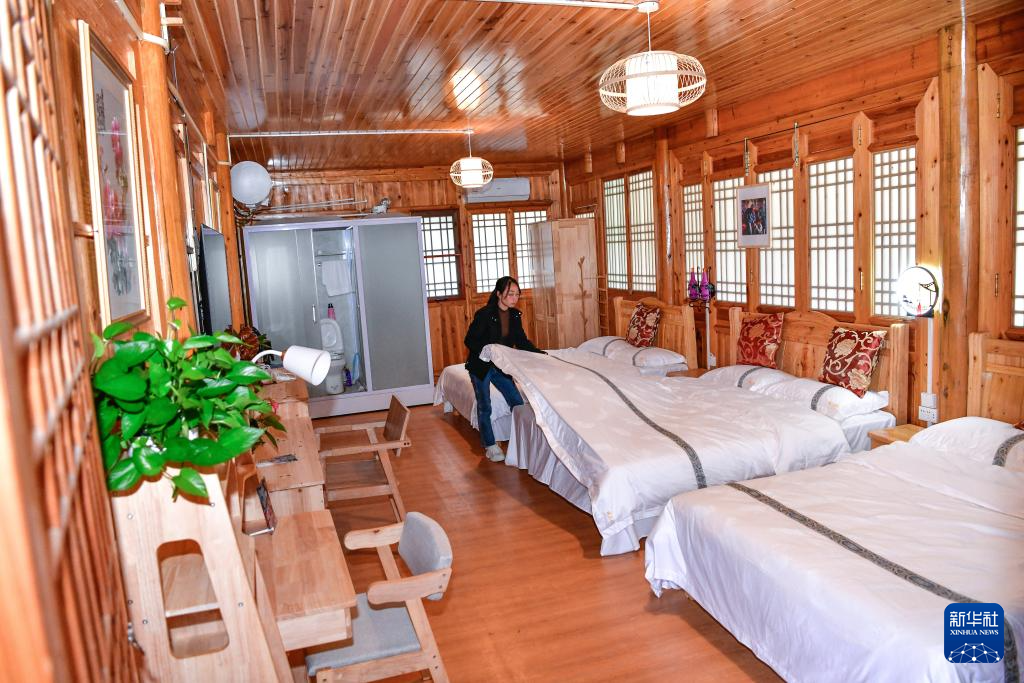11月15日,贵州省石阡县国荣乡楼上村的村干部在整理民宿床铺。