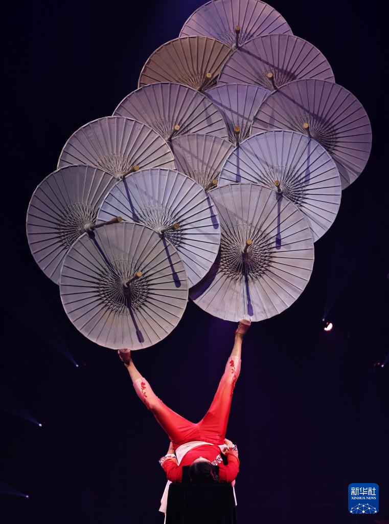 12月8日,演员在法国巴黎举行的中国杂技“奇妙之夜”演出上表演《蹬伞》。