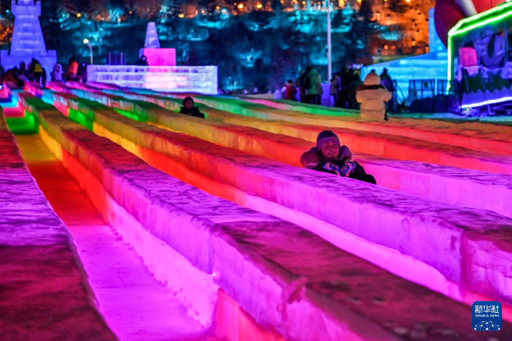 12月12日,游客在长春冰雪新天地体验冰滑梯。