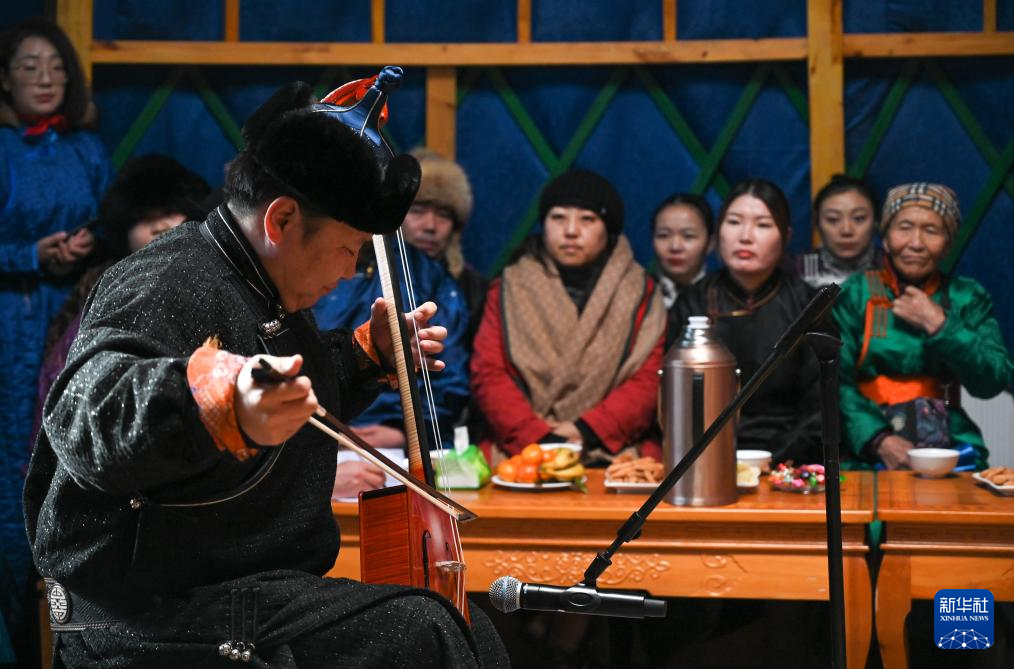 12月21日,乌兰牧骑队员在阿其图乌拉苏木进行马头琴演奏表演。