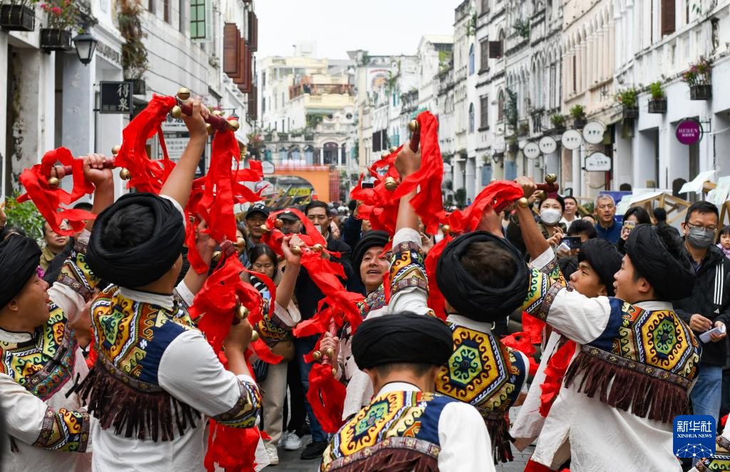 12月23日,来自湖南湘西的“土家族铜铃舞”在海口骑楼进行非遗巡游。