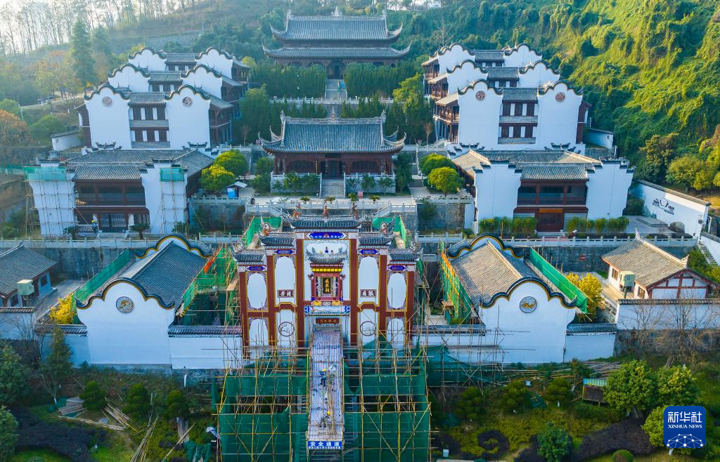 12月24日,工人在秭归县屈原祠山门前拆除脚手架(无人机照片)。