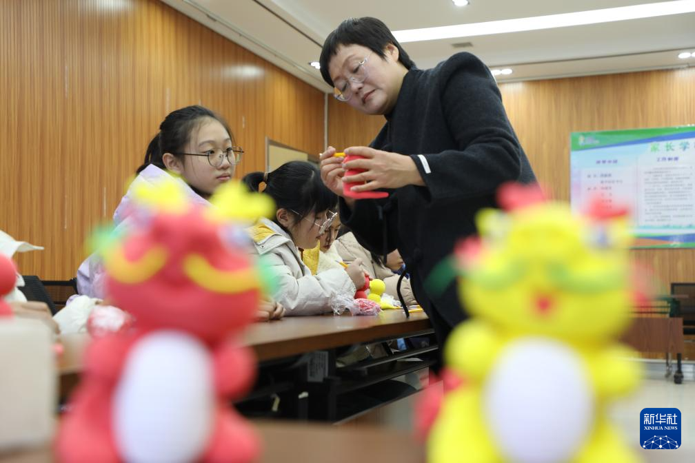 12月24日,在山东省滨州市沾化区富中社区,面塑老师指导孩子们制作面塑龙。