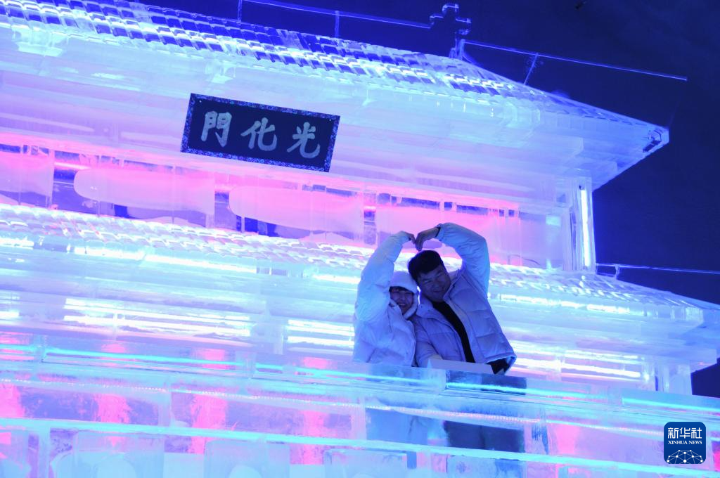 1月13日,在韩国江原道的华川山鳟鱼节现场,游客在哈尔滨工匠制作的韩国光化门冰雕作品前留影。