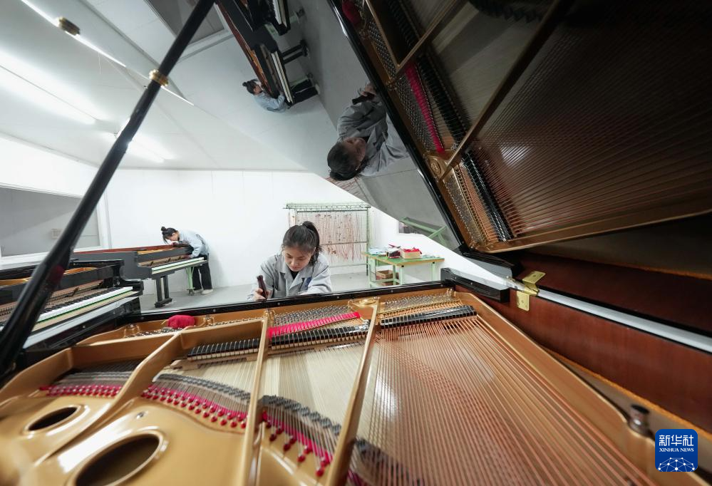 1月19日,工人在河北省肃宁县一家钢琴企业的生产车间工作。