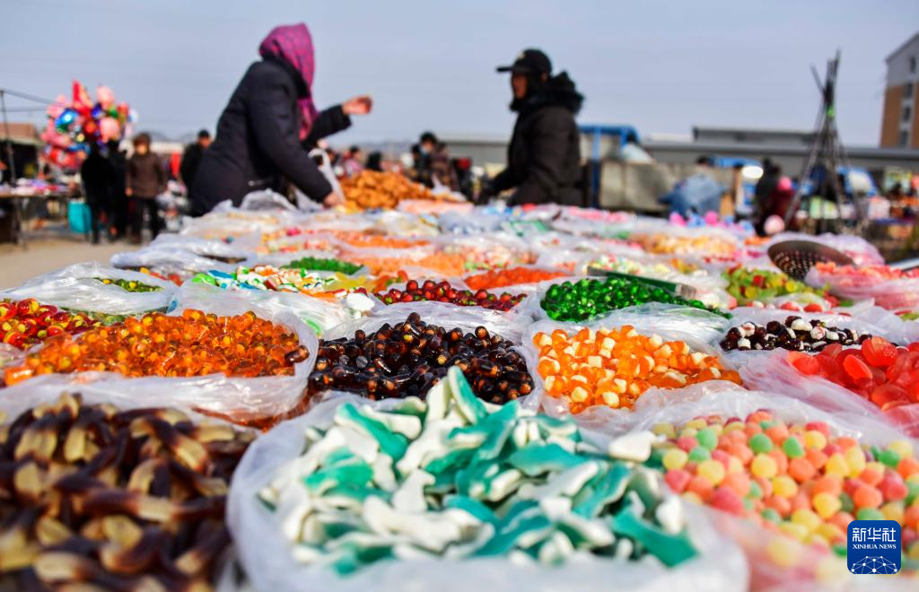 1月19日,人们在河北省遵化市平安城大集上选购糖果。