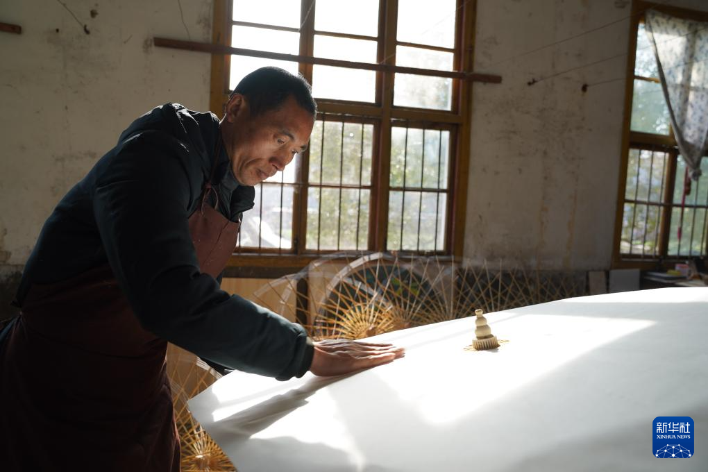 江西省婺源县赋春镇甲路村的工匠为甲路纸伞贴伞面(1月11日摄)。