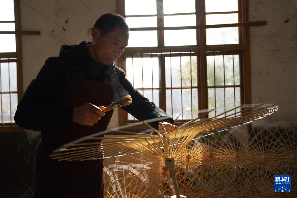 江西省婺源县赋春镇甲路村的工匠在甲路纸伞的伞骨上刷浆糊(1月11日摄)。
