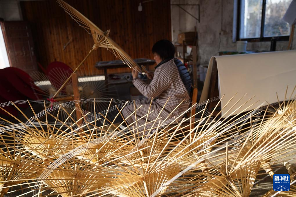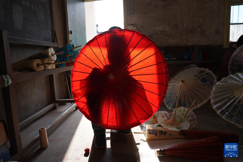 江西省婺源县赋春镇甲路村的工匠为甲路纸伞绕伞圈(1月11日摄)。