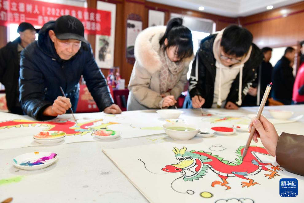 当日,山东省乐陵市组织农民画画师、剪纸老师、书法老师等文艺志愿者来到朱集镇,创作“龙”元素贺岁作品,迎接农历龙年的到来,为群众送上新春祝福。