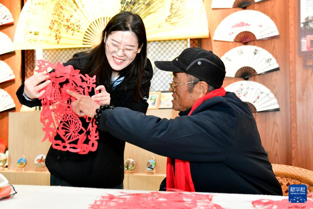 1月24日,在山东省乐陵市朱集镇文化站,剪纸老师(右)在介绍“龙年大吉”剪纸作品。