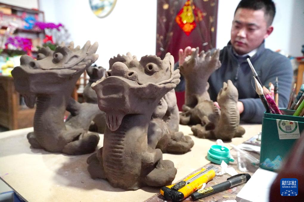 春节临近,在山东潍坊高密市姜庄镇聂家庄村,当地村民制作龙造型泥塑供应各地市场。聂家庄村有制作泥塑的悠久传统,2008年聂家庄泥塑被列为国家级非物质文化遗产。
