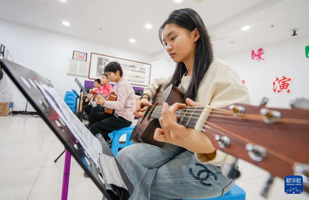 1月23日,学生在河北省遵化市一家培训机构学习弹奏吉他。