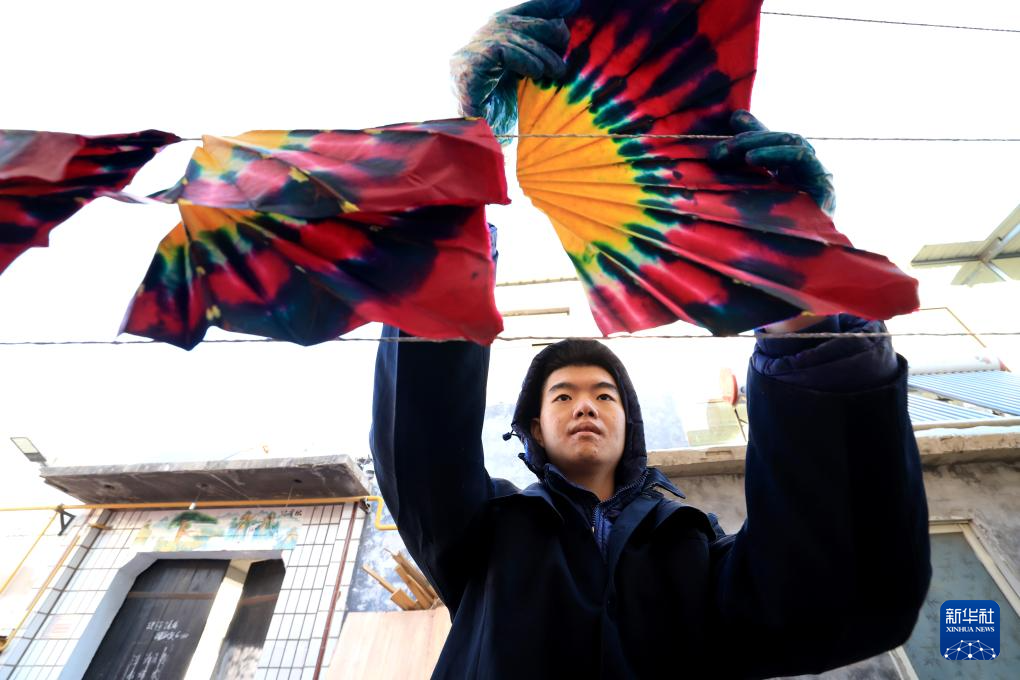 1月24日,在石家庄市栾城区邵家庄村,手工艺人在晾晒彩子。