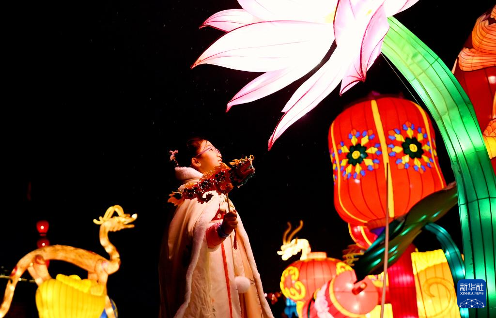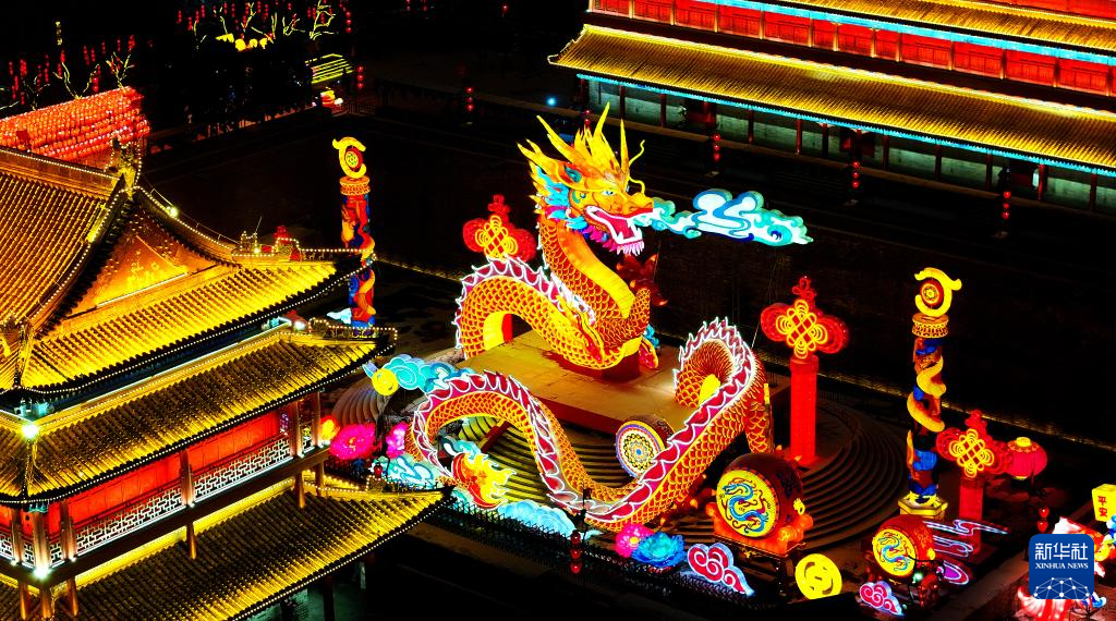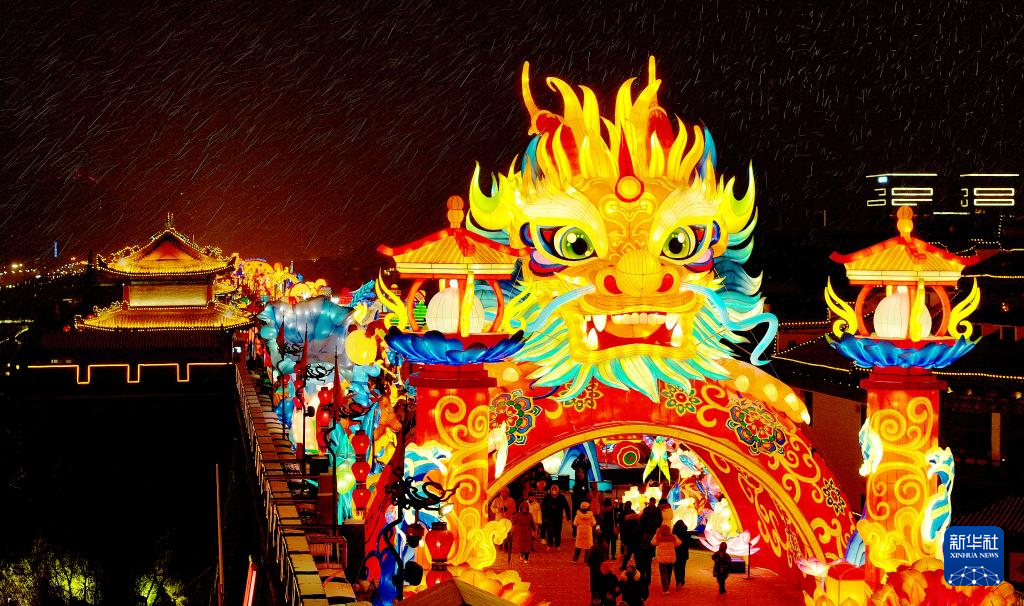 2月2日,龙形花灯在西安大唐芙蓉园点亮。