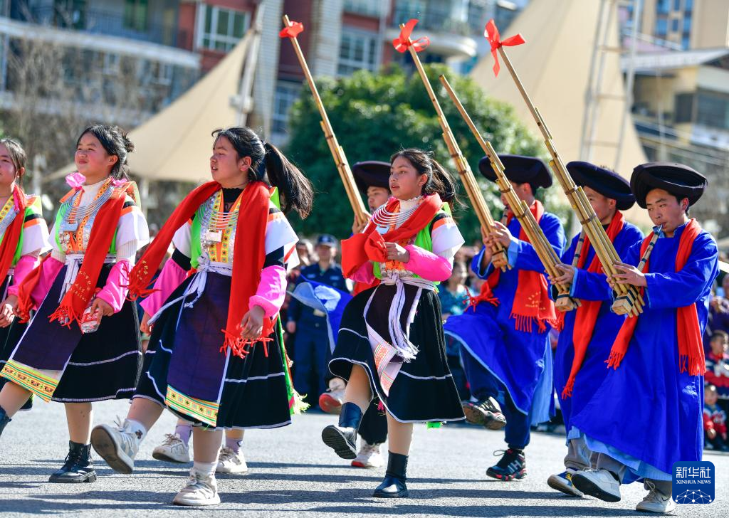 2月18日,人们在贵州省龙里县民俗踩街活动中跳芦笙舞。