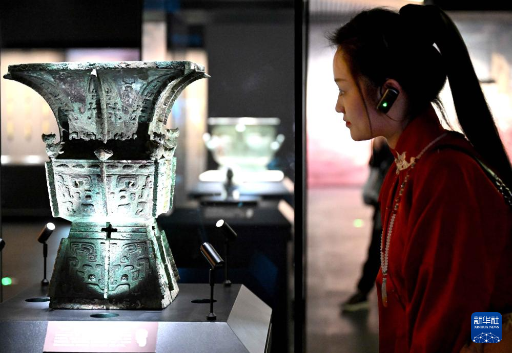 2月26日,参观者在河南安阳殷墟博物馆新馆内观看展品。